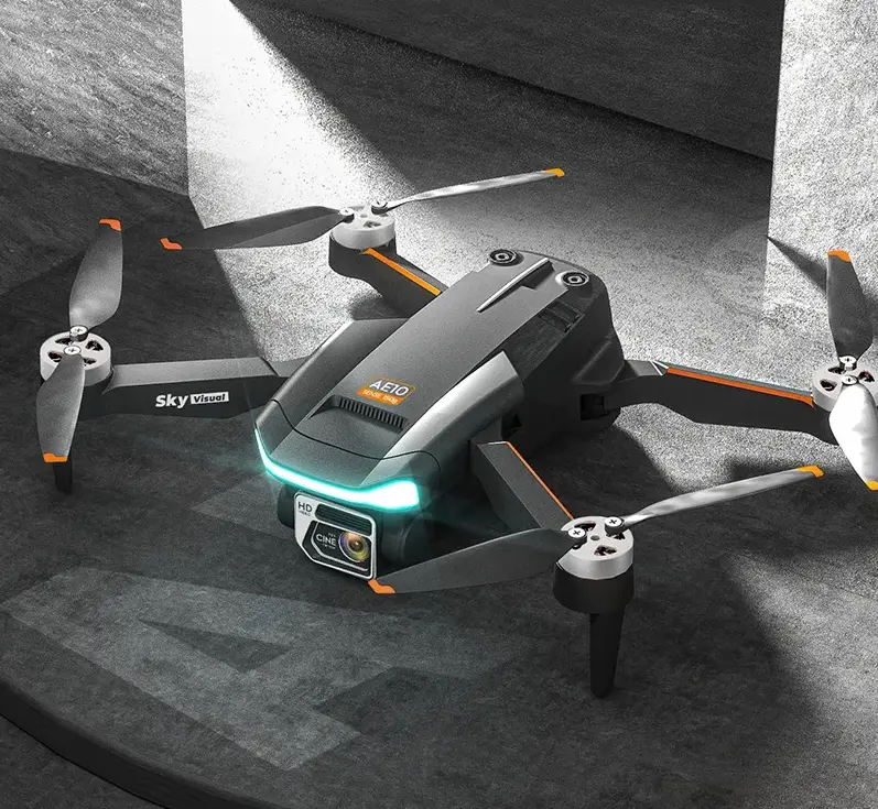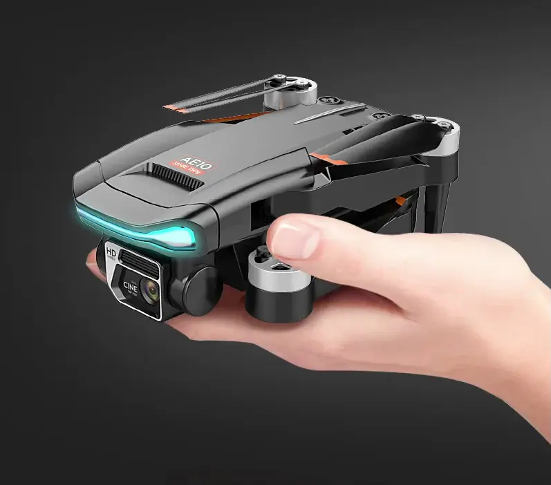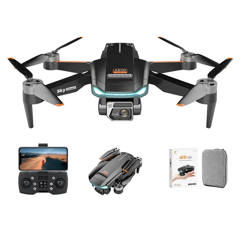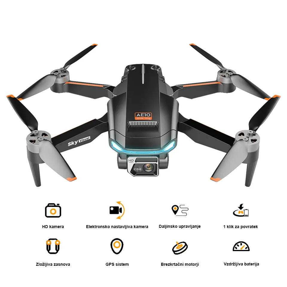 AE10 Mini dron z dvema kamerama in GPS pozicioniranjem omogoča napredno sledenje preko vgrajenega GPS modula in zajemanje visoko kakovostnih slike ter posnetkov. Za močan prenos signala skrbi 5G antena in sprejemnik, ki skupaj omogočata izjemno dolg domet in kakovosten prenos slike. Dron ima mnogo funkcij kot je upravljanje s kretnjami, samodejna vožnja po vnaprej določenih točkah, samodejni povratek ob nizki napolnjenosti baterije in več.