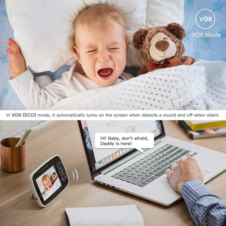- 2-smerna komunikacija – Vgrajen zvočnik ter mikrofon na starševski enoti in kameri omogočata oddaljeno komunikacijo med staršem ter otrokom. Pomirite ali uspavajte najmlajše z govorjenjem ali petjem na daljavo.