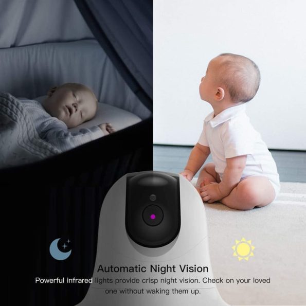 - Oddaljeno vrtenje kamere in povečava za širši vidni kot – Preko starševske enote je možno vrtenje kamere v vse smeri, kar omogoča širši vidni kot in boljši nadzor nad najmlajšimi. Omogočeno je 355° horizontalno in 120° vertikalno vrtenje.