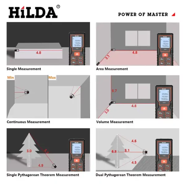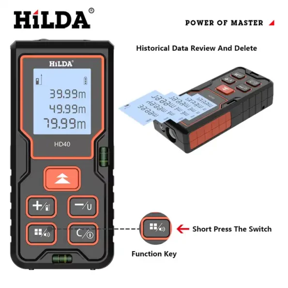 HILDA multifunkcijski baterijski LCD laserski merilnik razdalje do 100m je nepogrešljiv dodatek, kadar želite na hiter in zanesljiv način izmeriti razdaljo.