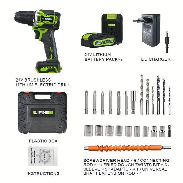 LFINE Drill Pro 21V akumulatorski vrtalnik/vijačnik, 2x baterija, komplet pripomočkov