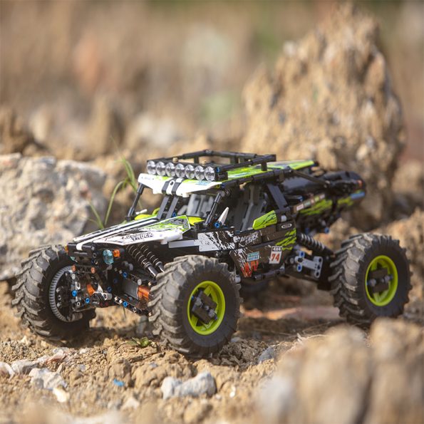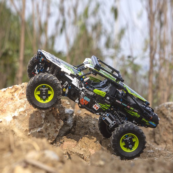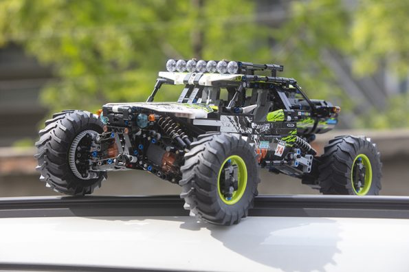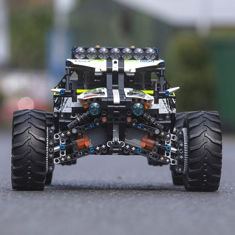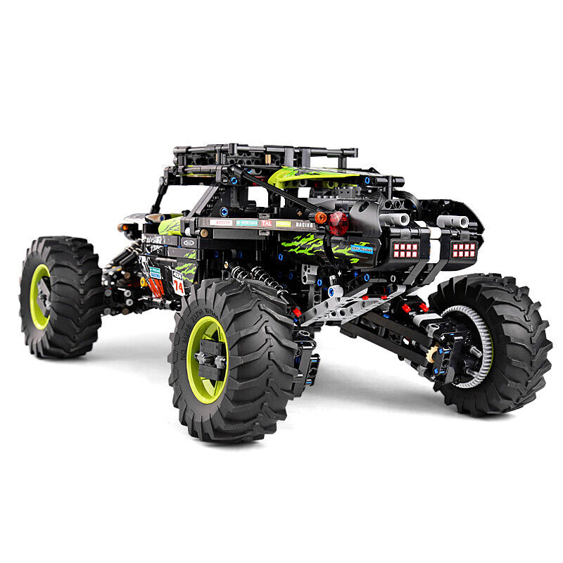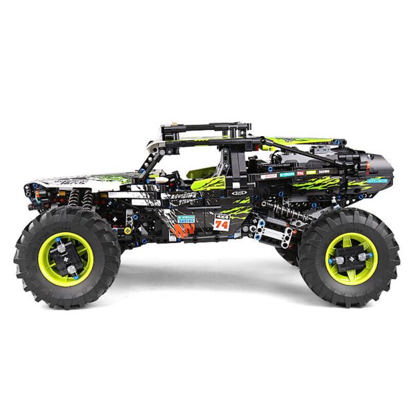 Mould King 18002 Green Monster Buggy 4×4 z motornim pogonom, bo osupnil vse navdušence nad sestavljanjem. Velikanski 43cm dolg model modernega terenskega vozila s polnim vzmetenjem, lahko upravljate preko aplikacije na pametnem telefonu ali preko priloženega daljinskega upravljalnika. Za plastične gradnike je uporabljena 100% ABS plastika, katera je izjemno vzdržljiva in ni škodljiva za zdravje. Vsi gradniki so visoke kvalitete in imajo visoko odpornost proti obrabi.