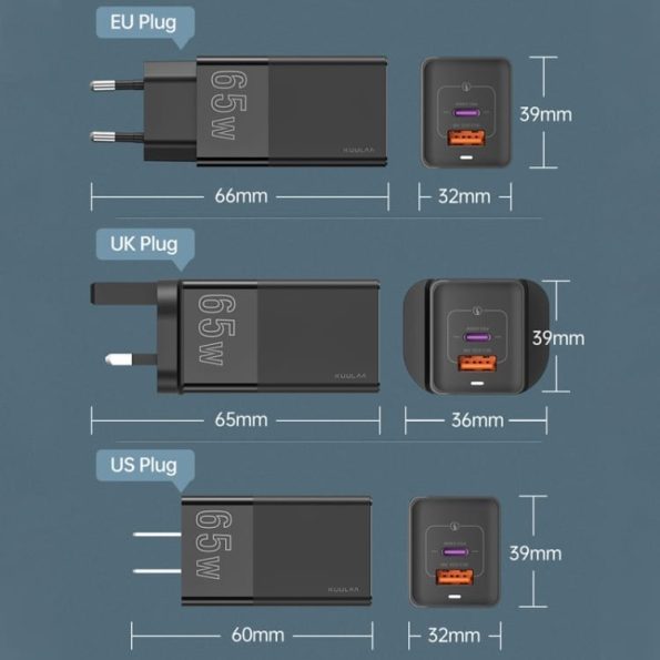Prenosni polnilni adapter Kuulaa 65W GaN QC3.0 in USB PD pomika meje zmogljivosti med polnilnimi adpaterji za pametne naprave. Zmogljivost polnjenja s 65W nudi stabilno in bliskovito hitro polnjenje pametnih naprav kot so pametni telefoni, tablični računalniki, prenosniki, konzole, itd. Vse več proizvajalcev pametnih naprav se odloča, da napravam ne prilagajo polnilnih adapterjev. Izbira kakovostnega polnilnega adapterja kot je Kuulaa 65W GaN je zagotovo prava izbira za zanesljivo in hitro polnjenje vaše naprave.