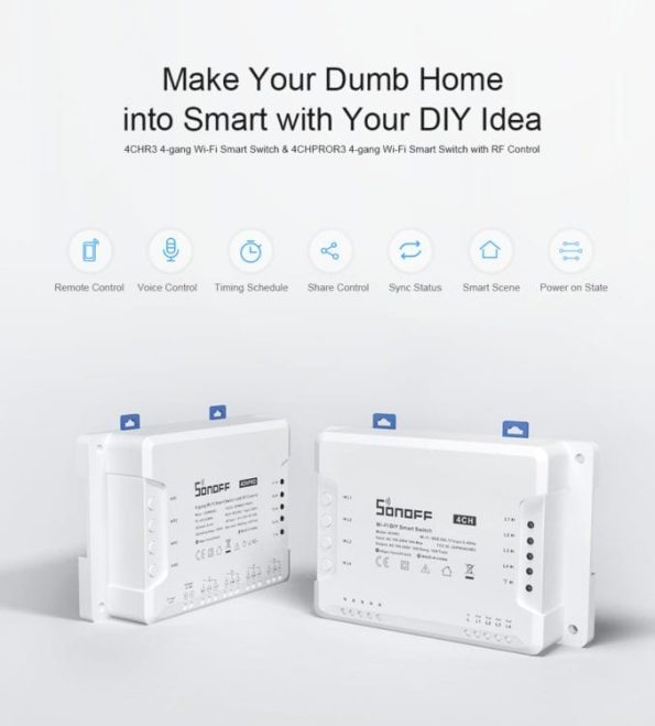 Sonoff R3 Pametno stikalo WIFI- 4 kanalno omogoča povezavo in oddaljeno upravljanje s kar 4 napravami hkrati. Upravljajte z razsvetljavo, različnimi napravami, nastavite pametne časovnike, glasovno upravljajte s povezanimi napravami ter mnogo več.
