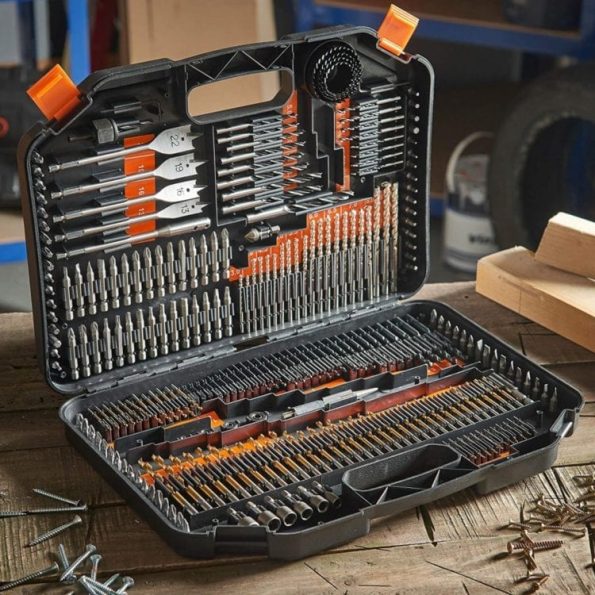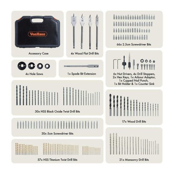 Komplet vsebuje: 87 x vrtalni svedri HSS, 22 x svedri za les, 21 x svedri za zidovje, 4 X svedri 66 x 25 mm bitov, 30 x 50 mm bitov, 6 X navojnih gonil, 2 X hex ključi, 1 X korito , 4 vrtalne žage X, 1 X adapter za vrtanje, 1 X Nail puncher in 1 X držalo
