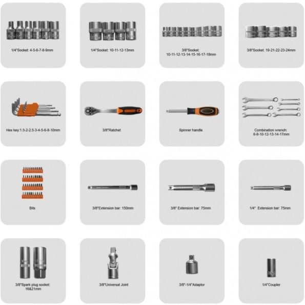 - Komplet vključuje kombinirani ključ, komplet šesterokotnih hex ključev, podaljšek za nasadne ključe 1/4 “in 1/8”, viličaste ključe, ragljo za nasadne ključe, reducirni nastavek, univerzalni kardanski zglob, podaljšek, nasadni ključi za svečke