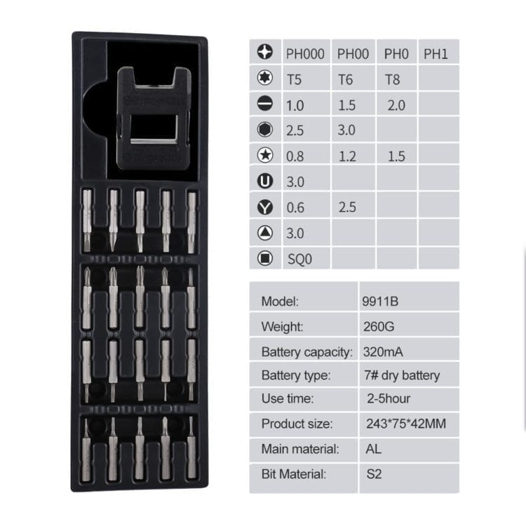 - Tip nastavkov: PH000,PH00, PH0, PH1, PH2, SL1.0, SL2.0, SL3.0, T5, T6, T8, P2, P5, P6, H2.5, H3, SQ0, Y2.5, U3.0, trikotni 3.0