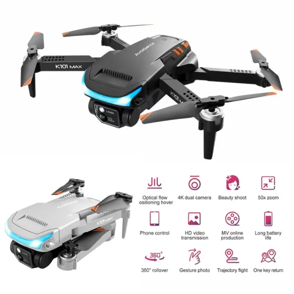 Zložljiv dron s kamero in sistemom za izogibanje oviram 4K K101 Max – Siv je prijazen za vsakogar, ne glede na predhodne izkušnje z upravljanjem. Popestrite prosti čas v krogu družine ali s prijatelji in upravljajte s tem izjemno zmogljivim in robustno izdelanim dronom.